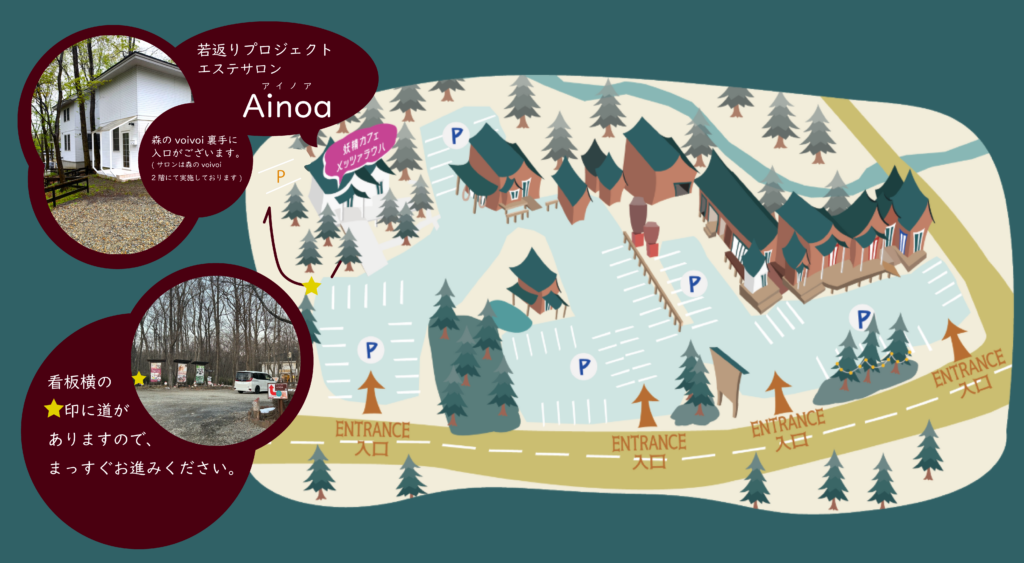 フィンランドの森の看板から少し北に位置する、パンケーキカフェ「森のvoivoi」の看板が目印です。