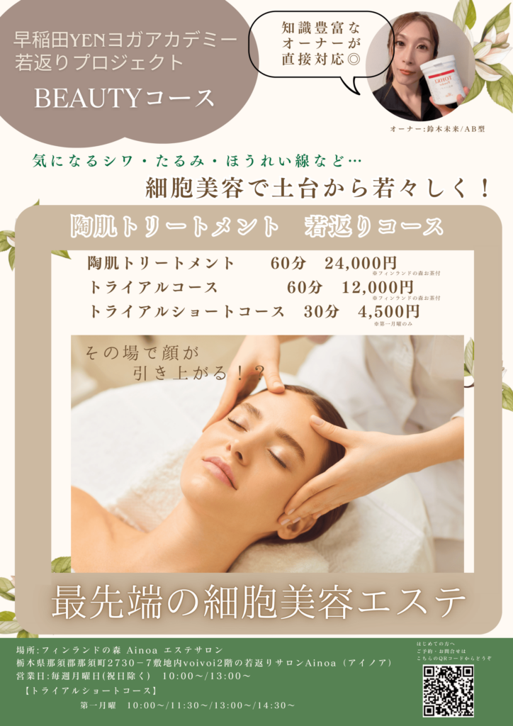 早稲田イエンヨガアカデミー監修のエステに、ゆったり身を任せながら、若返りにアプローチして、生き生きした健康ライフを謳歌しましょう!