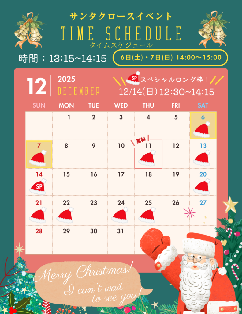 サンタクロースイベントの12月のスケジュールが決まりましたのでお知らせします🎅